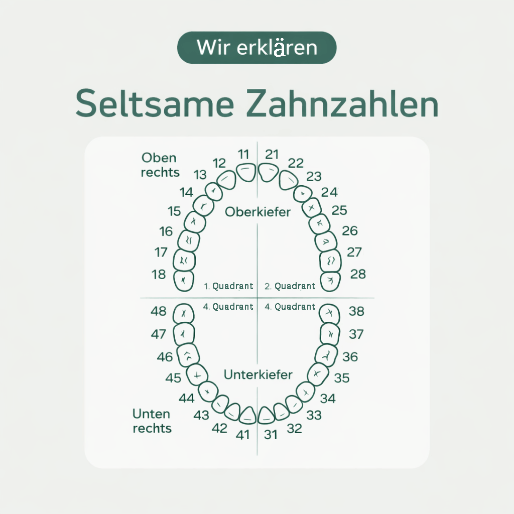 Die Zähne werden von der Mitte nach außen gezählt: von 1 (Schneidezähne) bis 8 (Weisheitszähne).